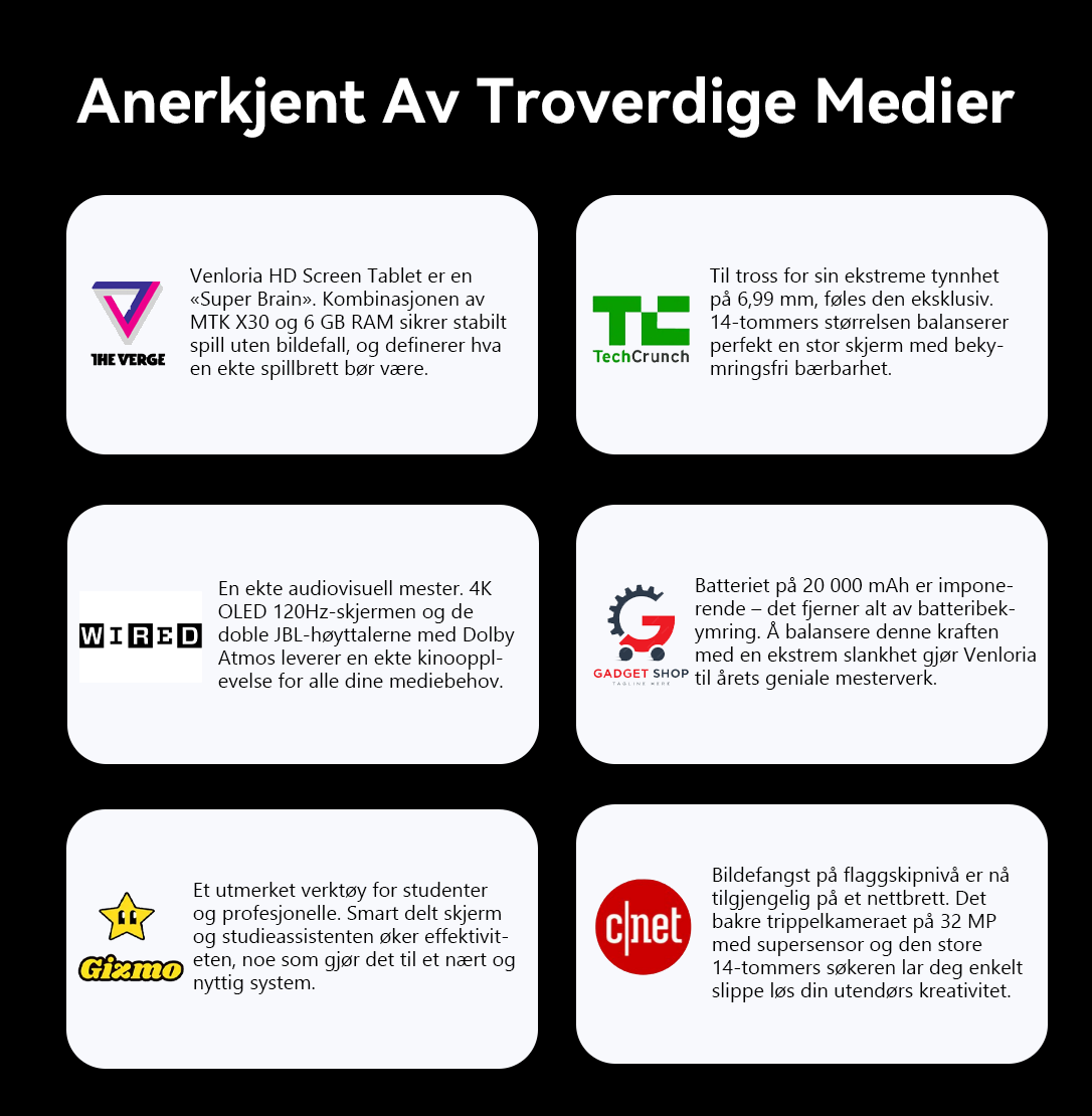 Venloria-nettbrettet er utstyrt med Doble JBL-høyttalere og støtter Dolby Atmos-teknologi. Profesjonell tuning fra JBL og de doble høyttalerne skaper et bredt og klart stereolydbilde med rike lag. Dolby Atmos lar lyden flyte i et tredimensjonalt rom for en kinoaktig opplevelse.
