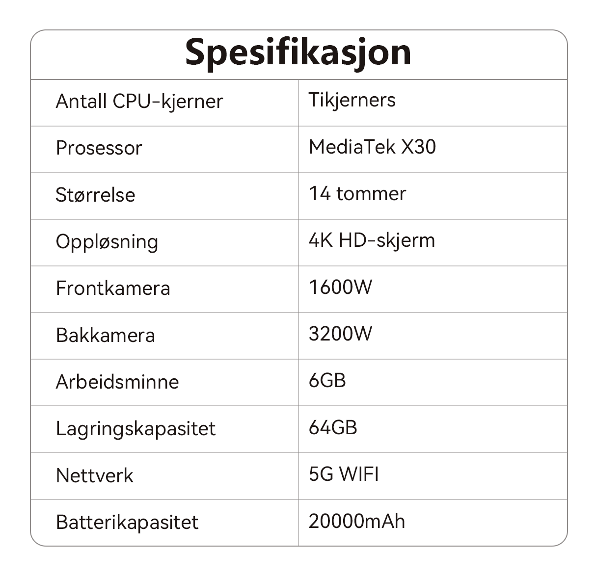 - MTK X30-prosessor – Leverer smidig ytelse for daglige oppgaver og multitasking.