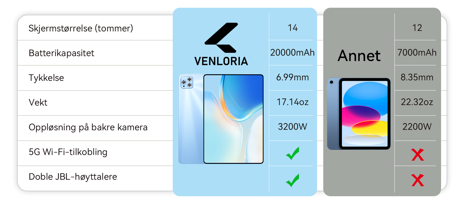 Nettbrettet løfter produktiviteten til et nytt nivå når det pares med det multifunksjonelle tastaturet. Tastaturet tilbyr enkel plug-and-play og forvandler umiddelbart nettbrettet til en tynn og lett bærbar PC. Enten du skriver rapporter, lager presentasjoner eller deltar i digitale møter, gir Venloria en smidig og effektiv mobil kontoropplevelse.